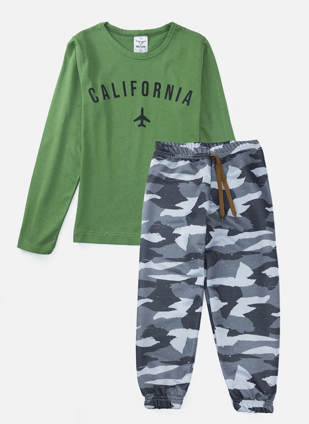 A blusa de manga longa, confeccionada em algodão na cor verde, é o destaque deste conjunto. Sua estampa apresenta a palavra "Califórnia" em destaque, acompanhada pela silhueta de um avião, evocando a sensação de liberdade e aventura. Com detalhes sutis e uma vibe descontraída, esta blusa é perfeita para os pequenos que sonham em explorar novos lugares e viver grandes aventuras.