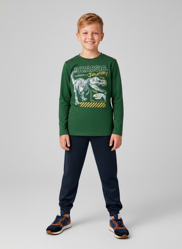A blusa, confeccionada em algodão na cor verde, traz mangas longas, reforço de gola em contraste laranja e uma estampa frontal com um fóssil de T-Rex, acompanhada de diversas escritas como "Jurassic Journey", despertando a curiosidade e o espírito explorador dos pequenos.