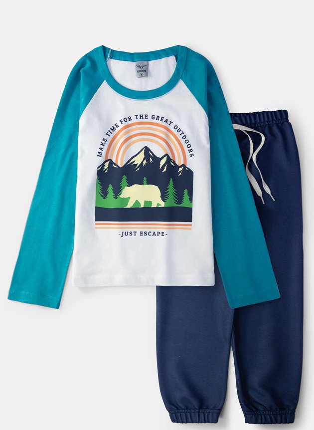 A blusa, confeccionada em algodão na cor creme, possui mangas longas e gola em contraste na cor verde água, trazendo um toque moderno ao visual. O destaque fica por conta da estampa frontal com um urso em meio a uma paisagem de montanhas, acompanhada de frases como "Make Time For The Great Outdoors" e "Just Escape", despertando o espírito explorador nos pequenos.