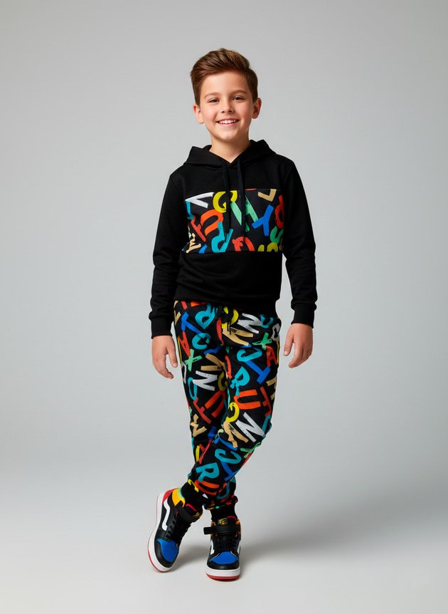 A calça, também em moletinho sublimado, é uma verdadeira festa de cores e letras. A estampa, que combina harmoniosamente com o recorte do blusão, traz a energia da infância para o conjunto. Os punhos em ribana e o cós com elástico rebatido, além do cadarço decorativo, garantem que a calça permaneça no lugar, proporcionando conforto durante todas as atividades.