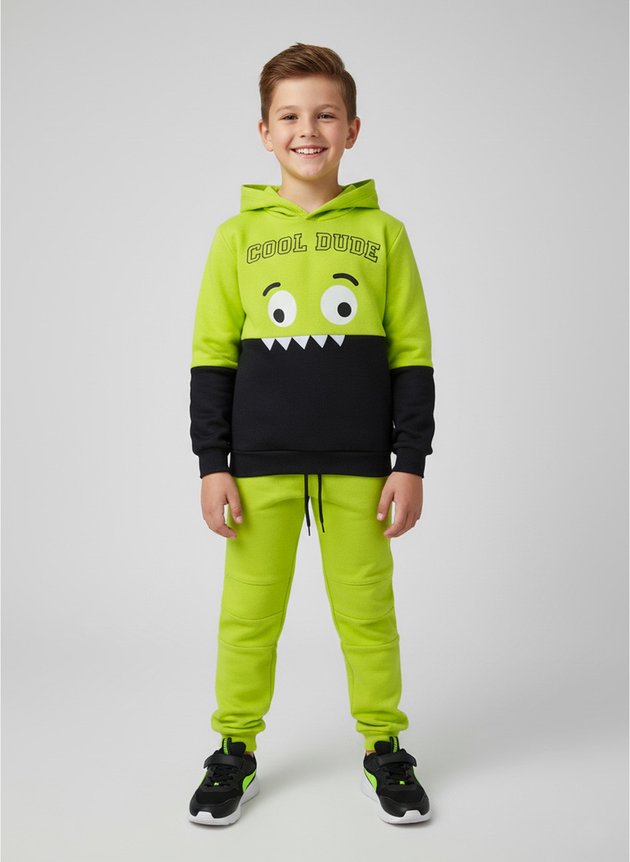 O casaco na cor verde traz um design cheio de personalidade, no estilo slim, com mangas longas e recortes contrastantes em preto nos braços e na linha do tórax. Possui capuz, punhos e barra em ribana para um ajuste perfeito. Na parte frontal, conta com uma estampa super divertida de um monstrinho acompanhado da escrita "Cool Dude", onde os dentes do monstro são detalhes em aplique termocolante em feltro, trazendo charme e diversão à peça.