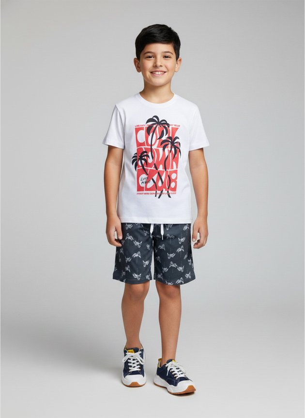 O Conjunto Infantil Menino "Palmeira Cool" combina praticidade, conforto e muito estilo para acompanhar o ritmo dos meninos!