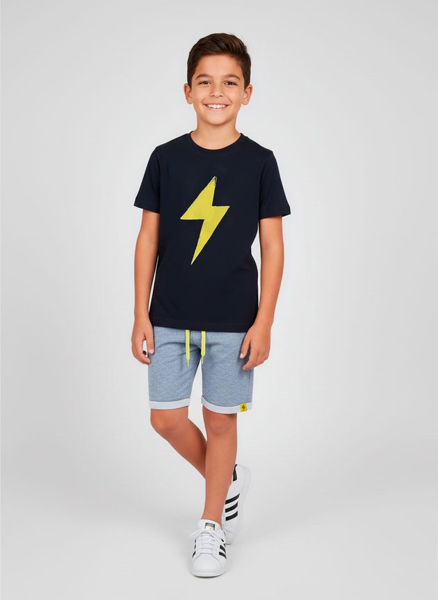 O shorts é confeccionado em moletinho leve e macio, ideal para o dia a dia. Conta com cós em elástico rebatido e cadarço aplicado na cor amarela, proporcionando ajuste confortável e seguro. O detalhe especial é a etiqueta clip na barra esquerda, estampada com um raio, criando harmonia com a camiseta e deixando o conjunto ainda mais estiloso.