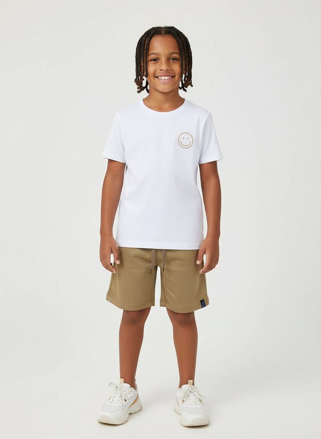 A bermuda confeccionada em moletinho com fundo marrom, conta com cós em elástico rebatido para um ajuste perfeito e cadarço aplicado que adiciona um toque moderno. O diferencial fica por conta da etiqueta clip com o rostinho de smile, que garante um charme extra à peça.