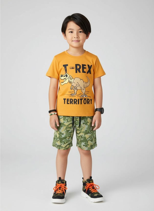 O Conjunto Infantil Menino "T-Rex Territory" é perfeito para os pequenos aventureiros que amam dinossauros e emoções noturnas.