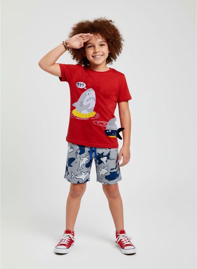 A camiseta de manga curta, na vibrante tonalidade vermelha, é mais do que uma simples peça de roupa; é um portal para o emocionante mundo subaquático. A estampa é um espetáculo por si só, apresentando não apenas um, mas dois tubarões - um deles com uma bóia e o outro com uma surpresa peculiar: um peixe travesso que está se passando por um tubarão! E aqui está o detalhe mágico: o peixe possui um rabo interativo que as crianças podem movimentar, tornando a experiência de vestir esta blusa uma aventura interativa.