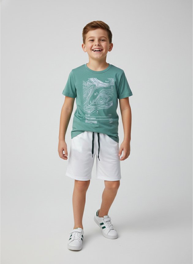 A bermuda produzida em moletinho na cor off, garante maciez, conforto e liberdade para brincar. O cós em elástico rebatido proporciona ajuste seguro, enquanto o cadarço decorativo verde complementa o look com um toque estiloso e harmonioso.