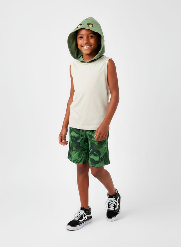 A regata é confeccionada em algodão na cor caqui, leve e confortável para os dias mais quentes. O diferencial está na estampa localizada nas costas, que traz o corpo de um dinossauro, além do capuz em contraste verde, com apliques nos olhos do dino, criando um visual lúdico e interativo que as crianças vão amar.