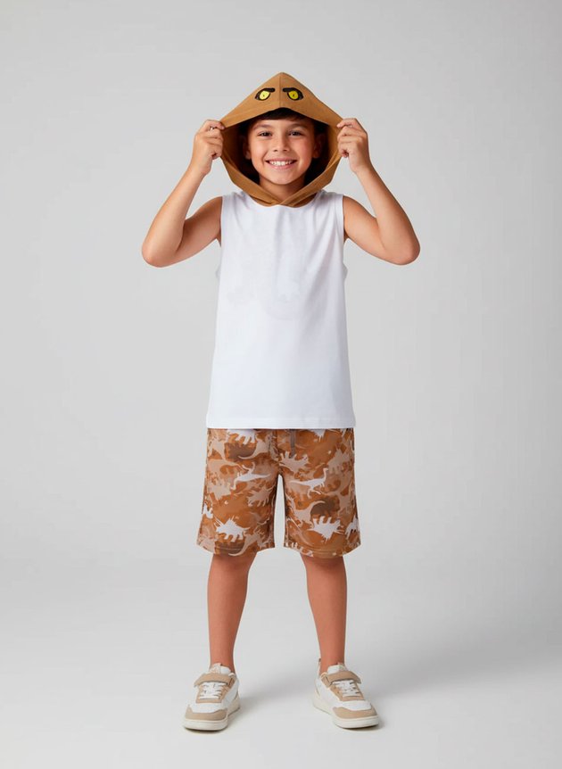 A regata é confeccionada em algodão na cor creme, leve e confortável para os dias mais quentes. O diferencial está na estampa localizada nas costas, que traz o corpo de um dinossauro, além do capuz em contraste ocre, com apliques nos olhos do dino, criando um visual lúdico e interativo que as crianças vão amar.