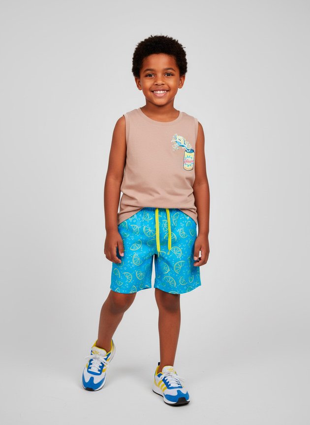 O shorts em tactel complementa o conjunto com conforto e praticidade. Com cós de elástico rebatido e um cadarço em amarelo lima para um ajuste moderno, ele também possui uma estampa corrida de fatias de limão sobre um fundo azul claro, criando um contraste vibrante que harmoniza com o tema energético da regata.