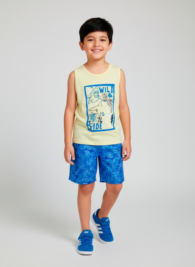 O Conjunto Infantil Regata Menino "Wild Side" é ideal para dias quentes e cheios de aventuras, com estilo descontraído e temático.