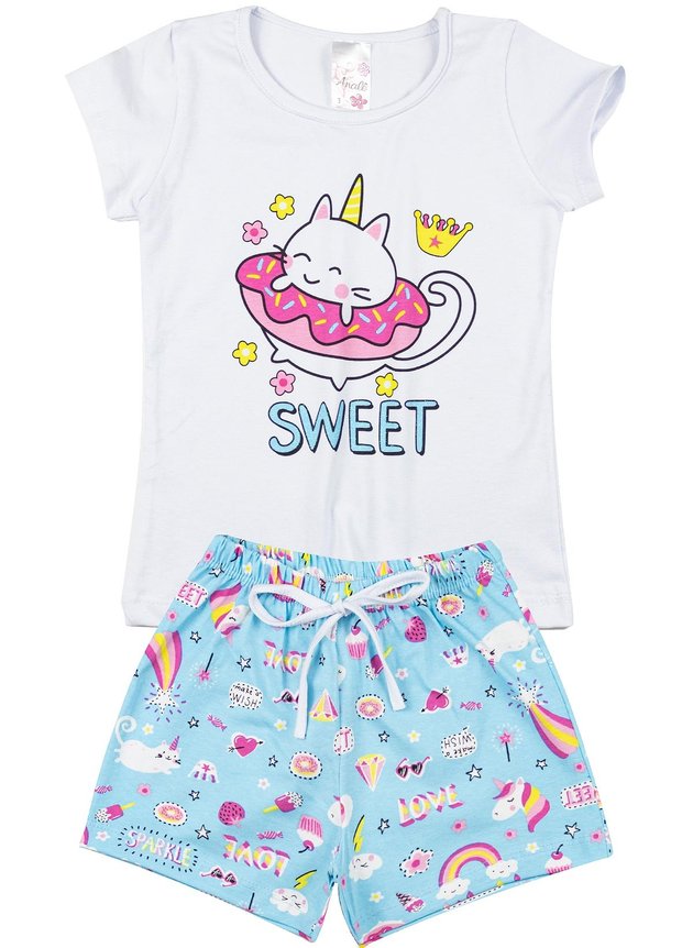 O conjunto é composto por duas peças: 1 Blusa confeccionada em cotton (85% algodão no mínimo), gola redonda e estampa frontal. 1 Shorts confeccionado em cotton estampado (85% algodão no mínimo), aplique em cordão e cós com elástico.