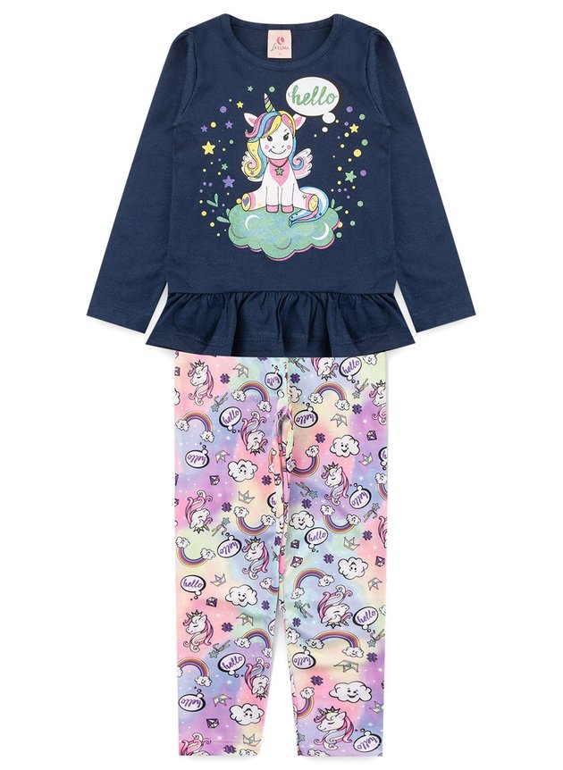 Conjunto composto por duas peças. 1 Blusa manga longa confeccionada em algodão, gola redonda, estampa frontal e barra em babado. 1 Legging confeccionada em suplex estampado e cós com elástico.