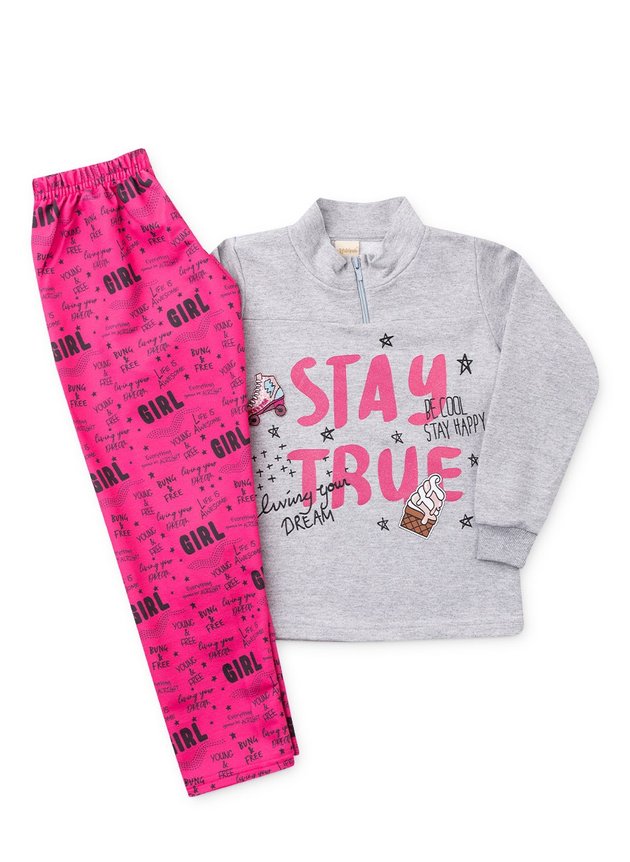 O conjunto é composto por duas peças: 1 Blusão confecionado em moletom sem felpa estampado, zíper frente, estampa com glitter e aplique termo colante. 1 Calça de moletinho sublimado e cós com elástico.