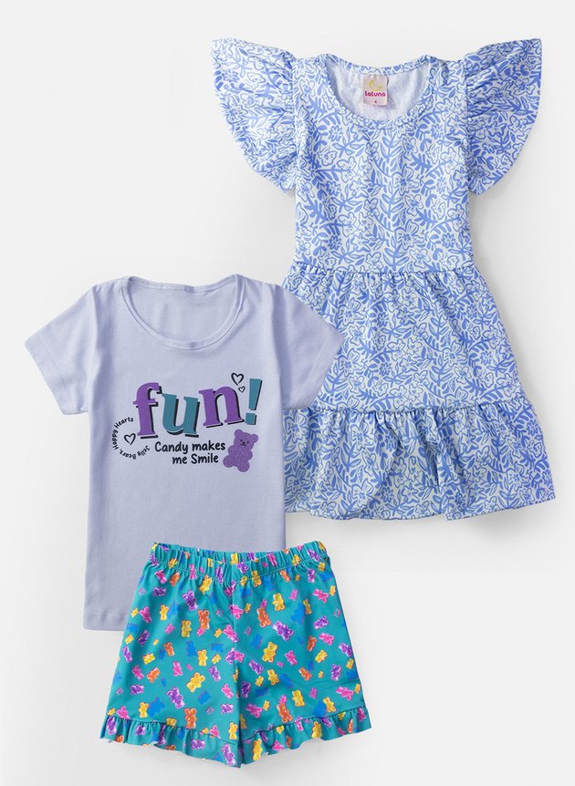 Kit de 1 Conjunto Infantil Feminino e 1 Vestido para o verão. São 3 peças versáteis, este conjunto infantil feminino de verão combina delicadeza e alegria em um visual encantador.