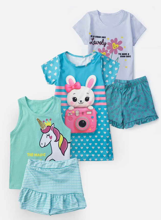 - Kit 3 Conjuntos infantil feminino, perfeito para as meninas que gostam de se destacar com estilo e conforto nos dias mais quentes.