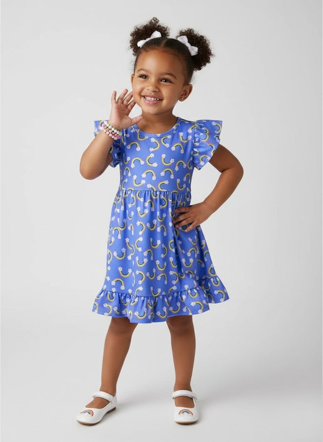 A peça trás mangas curtas de corte a fio com franzidos nos ombros, que adicionam delicadeza e um toque moderno ao visual. Possui ainda dois recortes no tórax, que dão caimento especial e valorizam o design do vestido. O grande destaque é sua estampa corrida exclusiva de arco-íris sobre um fundo azul, que deixa o look alegre, divertido e cheio de personalidade.