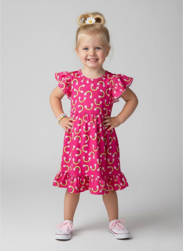 O Vestido Bebê Manga Curta "Arco-Íris" é perfeito para deixar as meninas ainda mais charmosas, com conforto e estilo em qualquer ocasião.