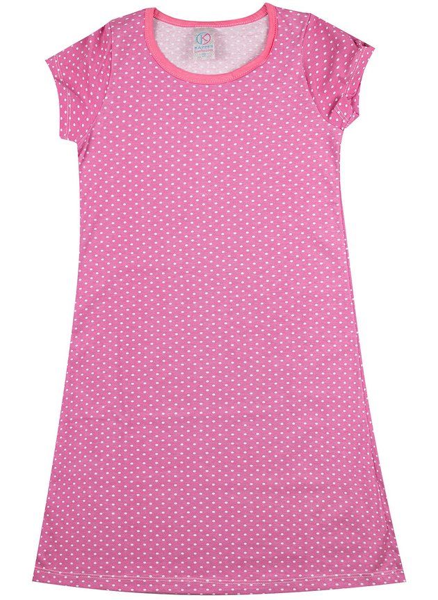 Vestido confeccionado em meia malha estampada (85% algodão no mínimo), gola redonda.