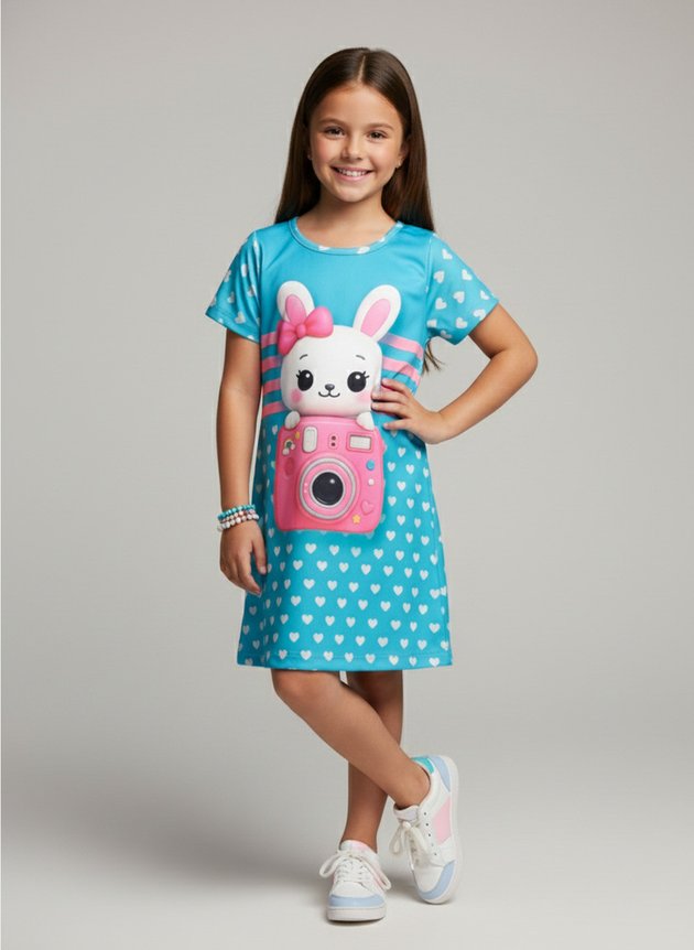 O Vestido Infantil Manga Curta "Coelha de Câmera" é perfeito para deixar o dia das pequenas ainda mais doce e divertido!