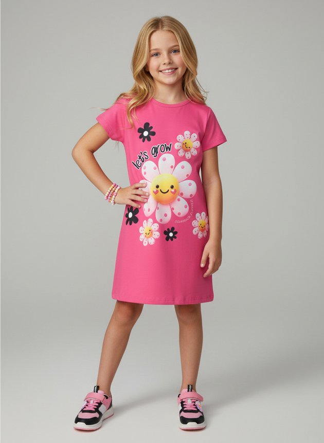 O Vestido Infantil Manga Curta "Let's Grow" é a escolha perfeita para deixar os dias das pequenas ainda mais alegres, coloridos e cheios de estilo!