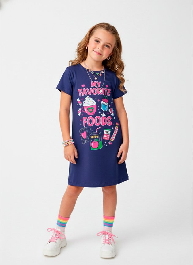 Versátil e cheio de charme, esse vestido é perfeito para passeios, escola e momentos de lazer, unindo conforto, estilo e diversão em uma única peça — do jeitinho que as crianças amam!